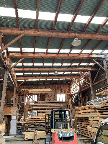 そこで、世界に誇る日本の建築様式である伝統工法を次世代につないでいきたいと、基本となる「墨付け」や「手刻み加工」を学べる大きな建屋「伝統工法伝承棟」をつくりました。古い工場を解体したときの古材を使い、すべて若い大工職人の墨つけと手刻み加工によるものです。